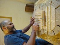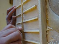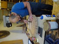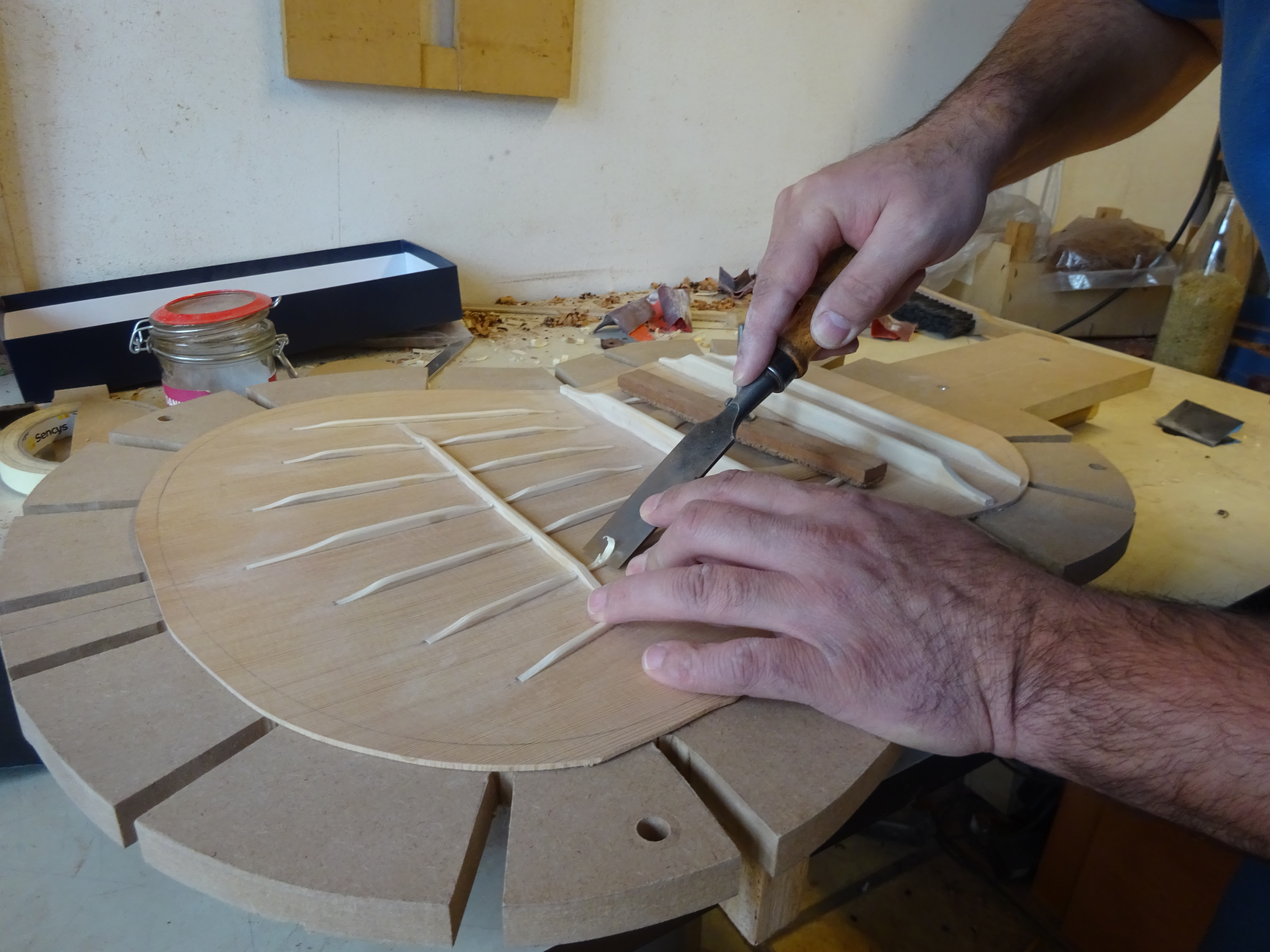 Na het inleggen van de rosette, wordt het bovenblad bebalkt en 'getuned'. Algemeen wordt dit aanzien als het belangrijkste werkje om de uiteindelijke klank te bepalen. Je moet rekening houden met de eigenschappen van je bovenblad, om de ideale bebalking te creëren. Het is logisch dat je dit niet kent als je een eerste keer een gitaar bouwt, dus hier heb ik een belangrijke functie.