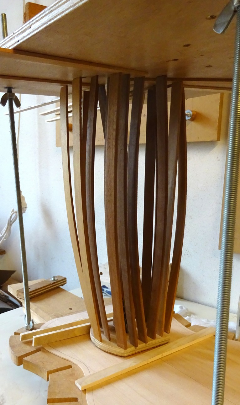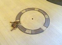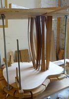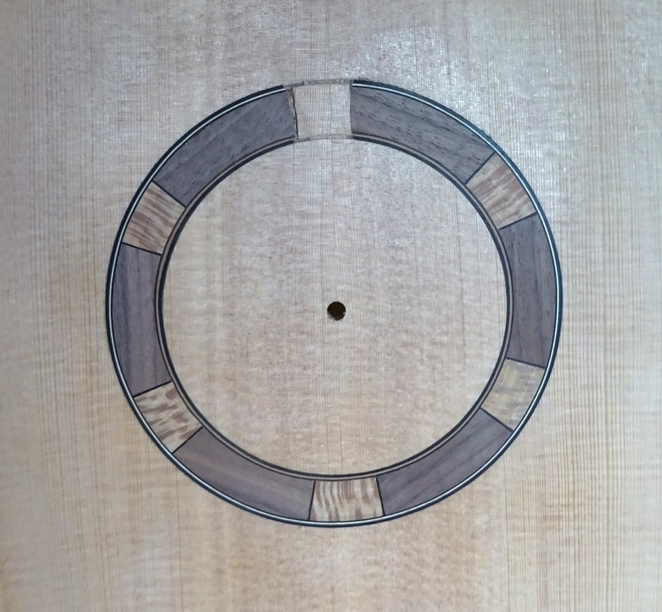 De rozet, toch een van de handtekeningen van een gitaar is ingelegd, en de versteviging onder de rozet zit er ook al op, dus na de opendeurdag kunnen we beginnen bebalken en de klank van de gitaar gaan bepalen.
